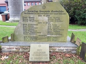 Am 13.11.2011, Volkstrauertag, wurde ein Gedenkstein seiner Bestimmung übergeben, der an das jüdische Feuerwehr-Gründungsmitglied Fritz Alexander erinnert.