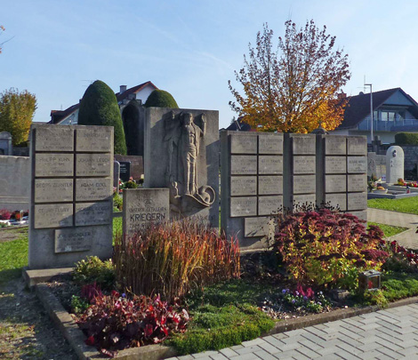 Das Kriegerdenkmal befindet sich auf dem Friedhof. Eine rechteckige Betonsäule auf der eine Christusfigur mit Drachen abgebildet ist.