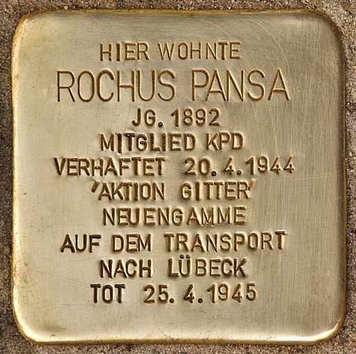 PANSA | Rochus | 1892 | 25.04.1945 | Mitglied KPD, verhaftet 20.4.1944 ‚Aktion Gitter‘ Neuengamme, auf dem Transport nach Lübeck tot |