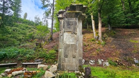 Schwer beschädigte Stele für den Ersten Weltkrieg oberhalb des Ortes.
