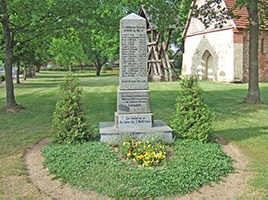 Eine Stele für die Gefallenen beider Weltkriege vor der kleinen Goldenstädter Kirche.