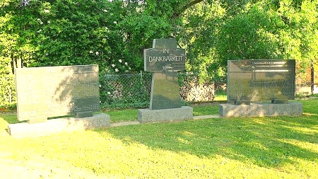 Bogenförmig angelegte Gedenkstätte, bestehend aus einem zentralen Steinkreuz aus Granit mit nachstehender Inschrift und je einer rechteckigen Stele aus Granit