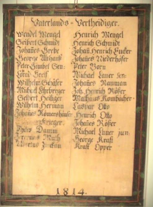 Die Teilnehmer des Krieges 1814 stehen auf Tafeln links neben der Orgel.