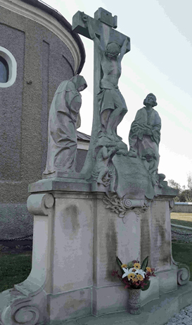 Verzierte abgestufte Sandsteinwand mit großen krönenden Figuren eines Kruzifixes und trauernder Frau und Mann.