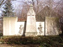 rechts und links davon Steinplatten mit den Gefallenen des Zweiten Weltkriegs.