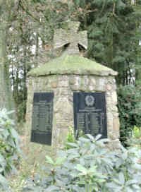 In einer kleinen mit Eisenketten umhegten Anlage steht das Ehrenmal für die Kriegstoten beider Weltkriege. Stumpfer Obelisk aus Feldsteinen aufgemauert,