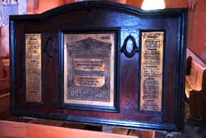 Gedenktafel aus Holz in der Marienkirche mit Verzierungen. In der Mitte Inschrift, links und rechts Namen.