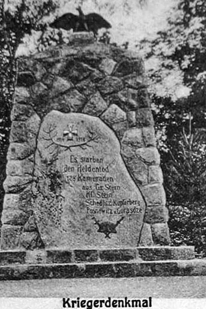 großer Findling mit der Widmung eingelassen war, gekrönt von einem Adler. Das Denkmal wurde nach 1945 abgerissen.