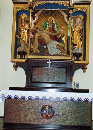 Ein holzgeschnitzter Pieta-Altar in der katholischen Pfarrkirche in Groß-Wartenberg, durch den Bildhauer Bruno Tschötschel im Jahr 1935 errichtet.