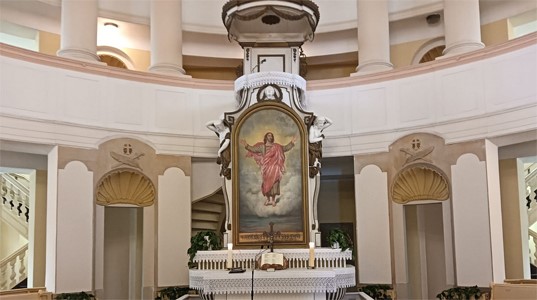 Diese Wandplaketten befinden sich an den Säulen neben dem Hauptaltar. Nach 1945 wurden alle Namen der Gefallenen sowie die Inschriften in deutscher Sprache übertüncht.