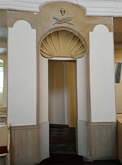 Als Überrest sind dekorative Ornamente erhalten: Ein gekreuztes Schwert mit Farn, das von einem Kreuz bekrönt ist.