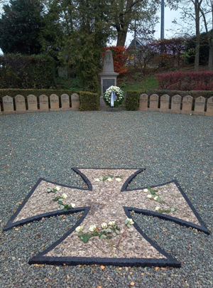 In die Freifläche vor dem Denkmal ist ein Kreuz in Form eines Eisernen Kreuzes eingesetzt.