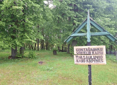 Ein Schild in litauischer Sprache weist auf den Friedhof hin.