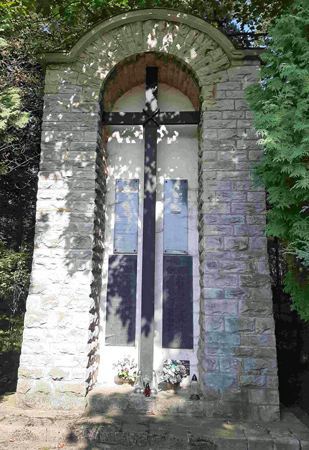 Denkmal für die Gefallenen des 1. Weltkriegs. Aus Natursteinen gemauerter hoher Torbogen mit darin aufragendem Kreuz