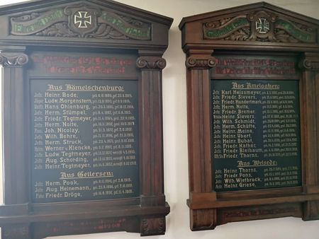 Hölzerne Gedenktafeln für den 1. Weltkrieg in der Kirche Sankt Marien, die zum Schloss Hämelschenburg gehört.