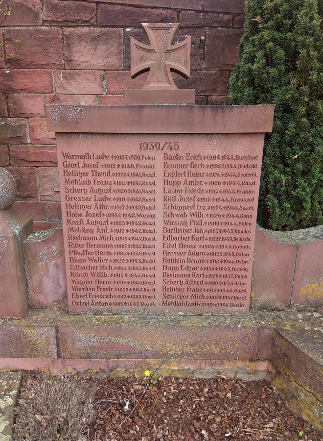 Feldgend. Trupp 411 | vermisst, Arbeiter; 1939 wohnhaft in Karbach, Ufr. Soldatenfriedhof in Rossoschka bei Wolgograd: Name auf dem Würfel 83, Platte 10 |