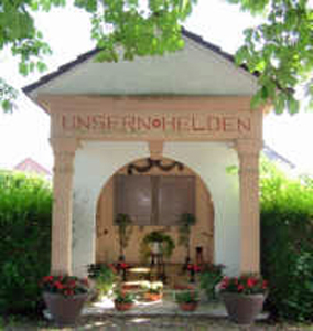 Offene Gedenkhalle in Form einer Kapelle auf dem alten Gemeindefriedhof. Auf den Wandtafeln die Namen und Daten der Opfer.