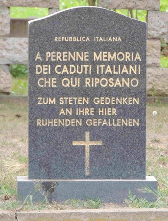 Denkmal und Kriegsgräberstätte des Zweiten Weltkriegs für Ausländische Opfer. Viereckige schwarze Stele mit den Namen. Gedenkstein für Italiener.