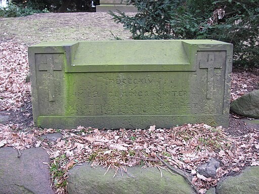 Gegenüber ein Gedenkstein für die Opfer der Verwüstung Hamms während der französischen Besetzung Hamms 1813/14. An dessen Vorderseite rechts und links ein christliches Kreuz. Dazwischen die Inschrift.