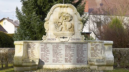 Kriegerdenkmal mit einem Bildnis des Hl. Georg. Zu beiden Seiten stehen zwei Kuben.