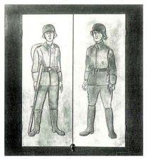 Auf den geschlossenen Türen befinden sich zwei Bilder von stehenden Soldaten - links ein Kriegsfreiwilliger, rechts ein „Kriegsleutnant“.