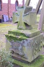 Quaderförmiger Sandsteinblock (Erster Weltkrieg) mit Eisernem Kreuz aus hartem Sandstein auf der Oberseite; am Sockel mit den Jahreszahlen 1914 und 1918 auf gegenüber liegenden Seitenflächen und mit Helmrelief auf der Vorderseite (ohne Namen der Gefallenen).