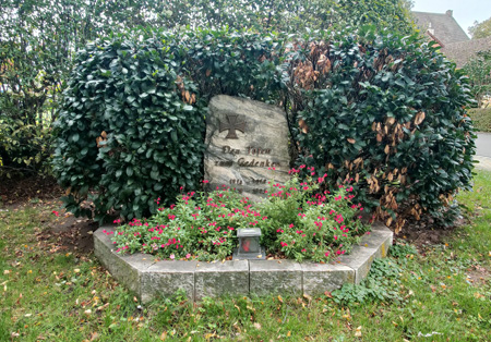 Allgemeiner Gedenkstein in einer kleinen Grünanlage hinter der Kapelle