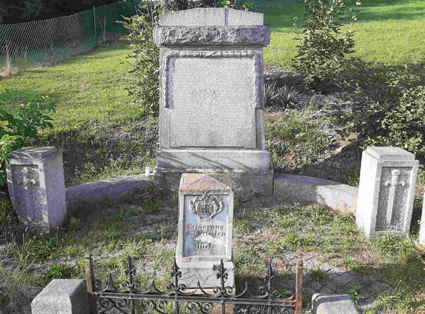 Davor ein kleiner Gedenkstein für den Krieg 1870/71. Das Ganze ist umfriedet mit Resten eines schmiedeeisernen Zaunes und kleinen Pfeilern.