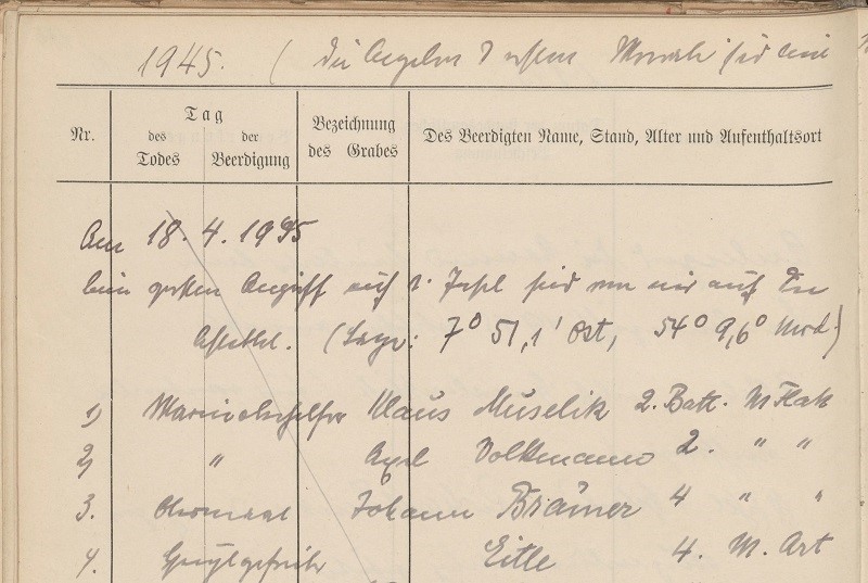 Am 18.4.1945 beim großen Angriff auf die Insel sind von mir auf …….. (Lage 7°51,1’Ost, 54°9,6°Nord)