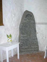 Im Turmraum der Kirche („Waffenhaus“) von Hellewatt ein aufrechter großer Findling, darauf Palmzweig und Inschrift.