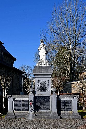 Steinsäule mit Figur. An der Säule sind weitere Gedenkplatten angefügt.