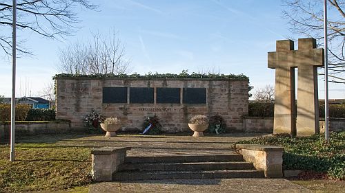 Steinwand mit Inschrift und vier Gedenktafeln. Davor zwei zusammenstehende Kreuze