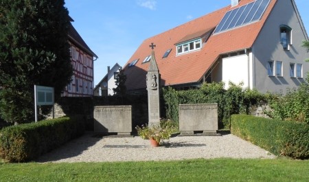 Denkmal für beide Weltkriege: Vierflächige, sich oben verjüngende Steinsäule. Auf den Seitenflächen die