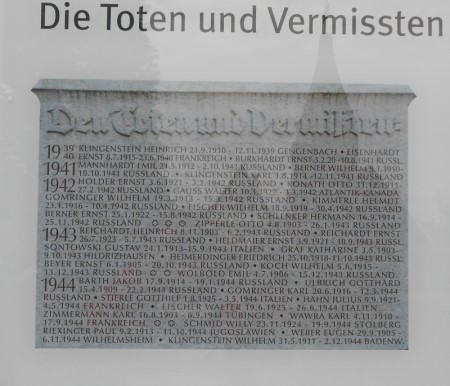Rechts und links der Säule befinden sich je eine Steintafel mit den Namen der Gefallenen des Zweiten Weltkrieges.