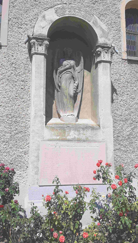 Namensfläche mit darüber aufragenden Torbogen unter dem eine Engelsfigur steht.