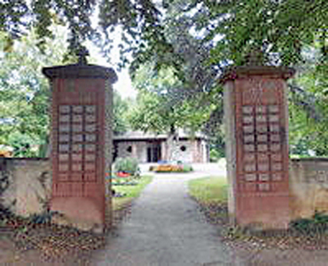 Links und rechts des Durchgangs am Hauptweg des Friedhofs stehen Säulen an denen Platten mit den Namen des 1. Weltkriegs angebracht sind.
