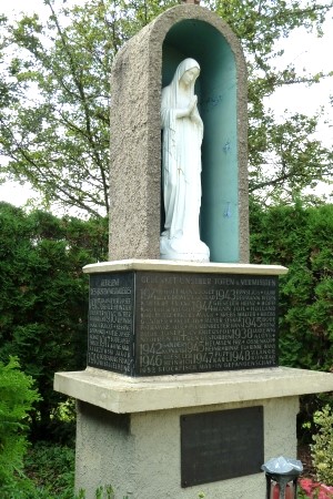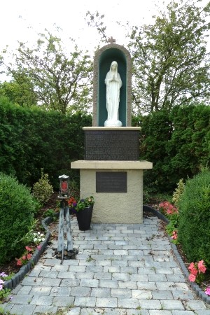 Das 1956 eingeweihte Kriegerdenkmal auf dem Friedhof mit der 1,30 m hohen Muttergottesstatue ist eingerahmt von Büschen und Bäumen.