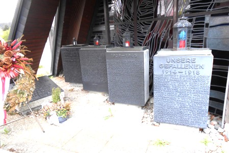 Friedhof: Johanneskapelle, in einer Nische des Turmes mehrere Steinblöcke stehend, darauf eine Metalltafeln mit den Namen beider Weltkriege.
