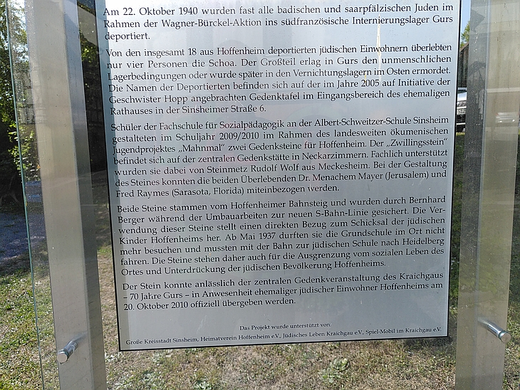 Der Gedenkstein für die am 22. Oktober 1940 deportierten jüdischen Bürgerinnen und Bürger von Hoffenheim steht an der Kreuzung Waibstadter Straße Silbergasse in einer kleinen Grünanlage. Eine Informationstafel ist am Rand der Anlage aufgestellt.