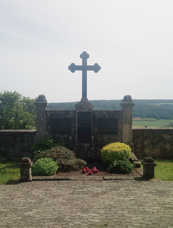 Steinkreuz auf hohem Sockel mit einer Mauer an beiden Seiten.