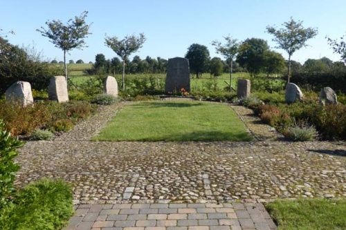 Im Halbkreis angeordnete Steinfindlinge, am Kopf ein größerer mit Kreuz. Auf den andern sind die Daten eingefügt.