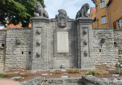 Kriegerdenkmal an Mauer unterhalb der ehemaligen Spinnerei, die 1907 von Fritz Hornschuch als Zweigbetrieb