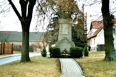 Als Eisernes Kreuz stilisierte Stele aus Sandstein. Das Denkmal befindet sich unmittelbar an der Hauptstraße in einer kleinen Anlage. Statt Ketten u. a. Absperrungen sind hier Büsche gepflanzt. Die Stele als Hauptteil ist an den Kanten vertieft um den Kreuzescharakter des gesamten Denkmals hervorzuheben. Auf den Flächen sind Tafeln mit verschiedenen Inhalten angebracht. Der Kreuzungspunkt ist mit Eisernen Kreuzen gestaltet und den Abschluss nach oben bildet ein solches Kreuz aus Sandstein. Der untere Teil des Denkmals wurde mit einer Girlande aus Sandstein umwunden. Auf dieser ist ein im Halbrelief gearbeiteter Stahlhelm zu sehen, unter dem Gerät wie Seitengewehr u. ä. liegt. In den Bögen gibt es auch Tafeln mit Inschriften. Teilweise starke Verwitterungseinflüsse haben der Anlage zugesetzt und machen eine Restaurierung notwendig. Dazu wurden neben der Anlage Schaukästen mit Listen der Teilnehmern (1813) und Gefallenen dreier Kriege aufgestellt.