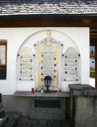 Außen an der Friedhofskapelle: Nische mit drei Marmortafeln mit Namen und Fotos der Gefallenen.