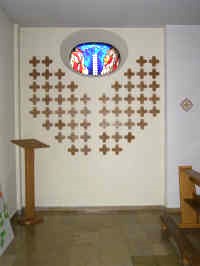 Die Holzkreuze für die Gefallenen bzw. Verstorbenen des Zweiten Weltkrieges befinden sich links neben der Eingangstür der r.k. Kirche „Schmerzhafte Mutter“ in Icker.