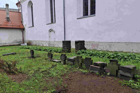 Zwischen den Grabkreuzen sind noch die Füße der abgeschlagenen Kreuze aufgestapelt. Dies sind noch zehn Stück.