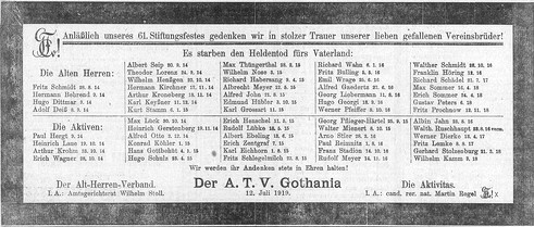Anzeige vom 12.07.1919 in den Jenaer Nachrichten. In der Anzeige werden 60 Namen von Gefallenen aufgeführt, getrennt in nicht mehr aktive und aktive Mitglieder des Vereins.