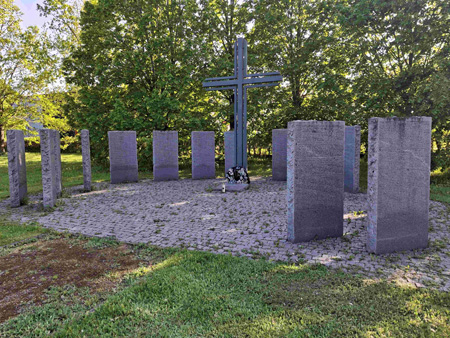 Dort steht ein Hochkreuz, das von aufgerichteten Granitplatten umrandet wird, auf denen die Namen