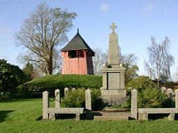 Auf dem Kirchhof von Jordkirch (Hjordkær) in einer von Steinpfosten mit Ketten sowie Steinbänken umsäumten kleinen Anlage ein Obelisk mit Kreuz auf der Spitze.