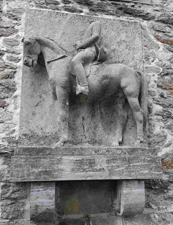 An der Kirchen-Außenwand das Standbild eines reitenden Soldaten mit umgeschnalltem Stahlhelm